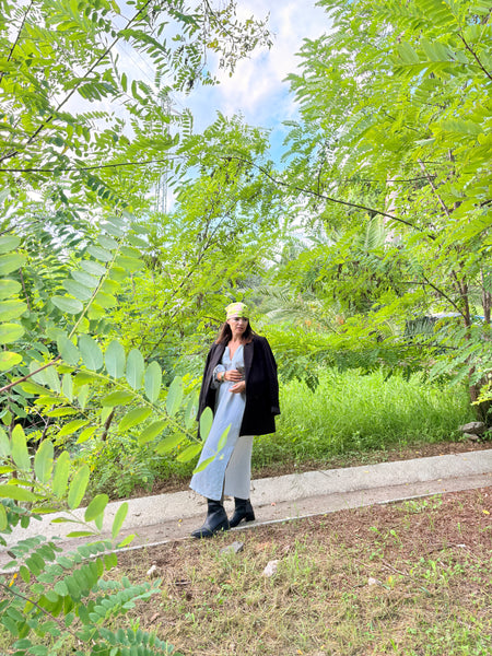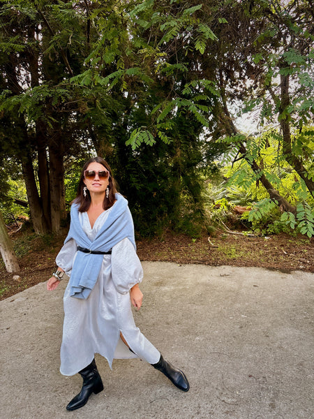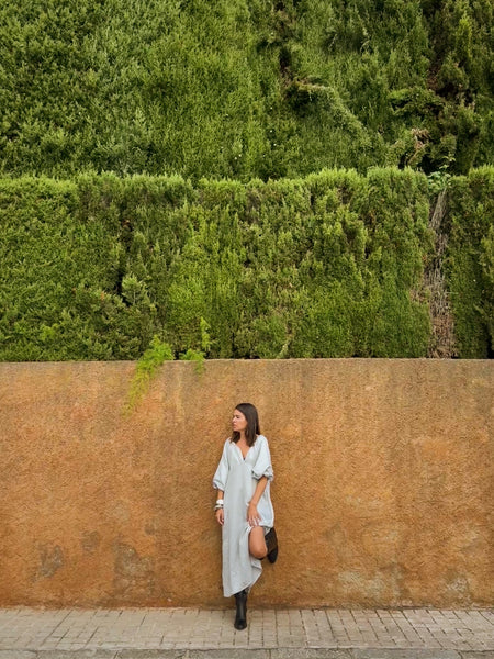 Un vestido que respira elegancia sin esfuerzo. Su tono gris perla ilumina la piel y aporta serenidad, mientras que las mangas abullonadas y aberturas laterales le dan un aire contemporáneo.